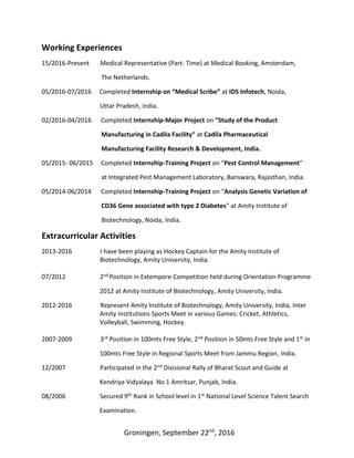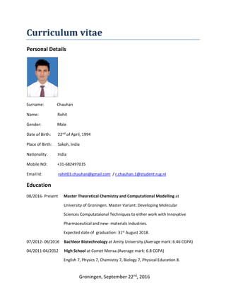 Rohit Chauhan is currently pursuing a Master's degree in Theoretical Chemistry and Computational Modelling at the University of Groningen in the Netherlands. He obtained his Bachelor's degree in Biotechnology from Amity University in India. Rohit has work experience as a medical representative and has completed internships in medical scribing, pharmaceutical manufacturing, pest control management, and genetic analysis related to diabetes. He is skilled in laboratory techniques, computer programs, and speaks English, Hindi, Punjabi and is learning Dutch. Rohit enjoys sports such as field hockey, soccer and swimming.