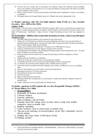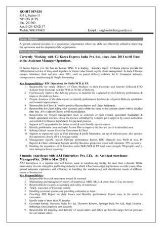 Rohit Singh is seeking a growth-oriented position in a progressive organization. He has over 10 years of experience in logistics and supply chain management. His most recent role was as Senior Assistant Manager Operations at CJ Korea Express India Pvt. Ltd., where he managed operations for Delhi/NCR and UP, including timely delivery, performance analysis, and managing a team of 250 people across 16 branches. Prior to this, he held roles with increasing responsibility at various logistics companies, handling key accounts, business development, customer satisfaction, and inventory management. Rohit Singh has an MBA in International Business from Jamia Millia Islamia University.