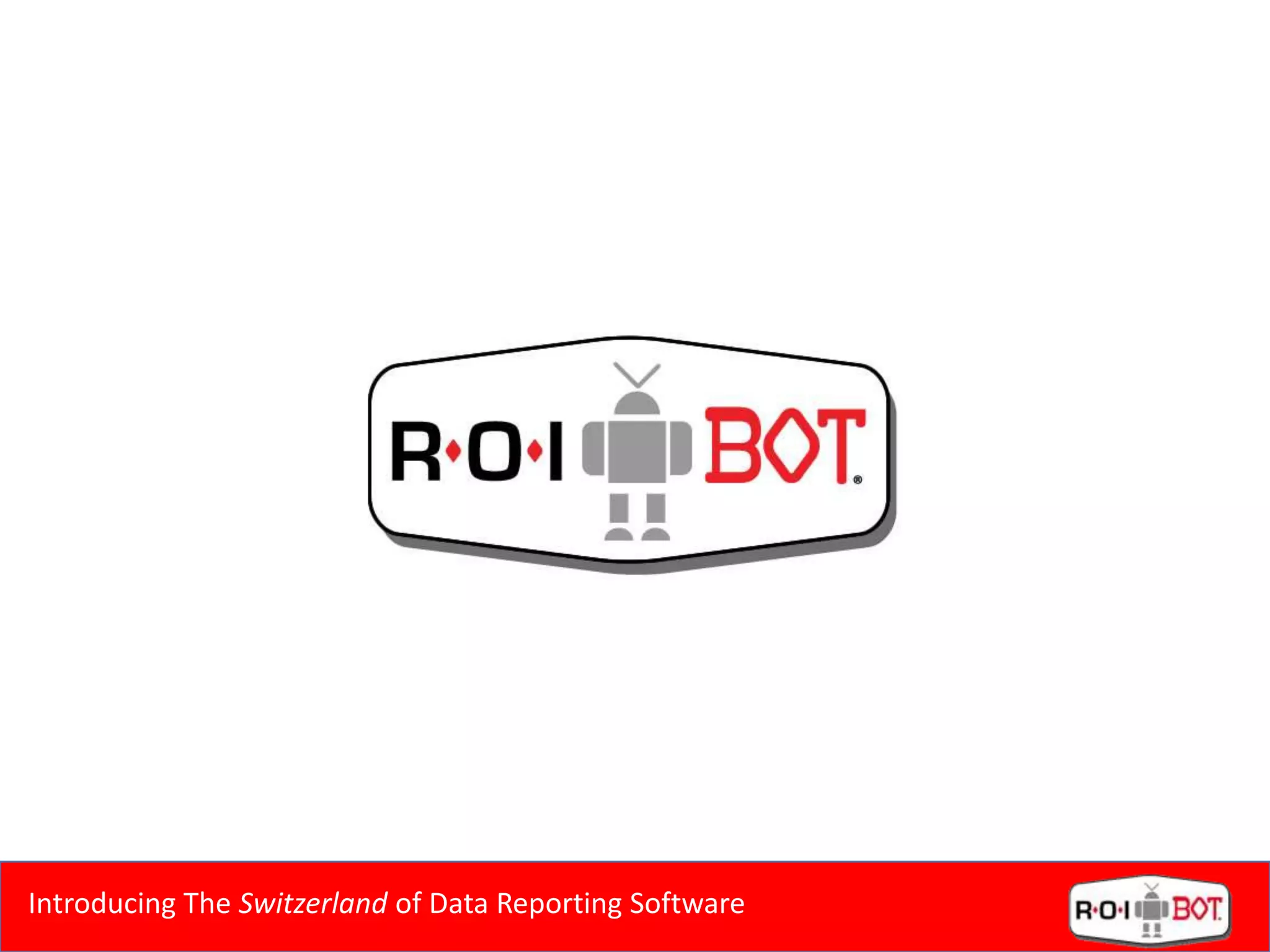 The document introduces a data reporting software designed for dealerships to streamline data management and improve efficiency. It highlights issues such as data overload and the challenge of having too many logins and dissimilar interfaces, and proposes a vendor-neutral data warehouse solution. The software, named roi-bot, offers features such as a single login, custom alerts, and actionable insights for better management and collaboration among dealership teams.