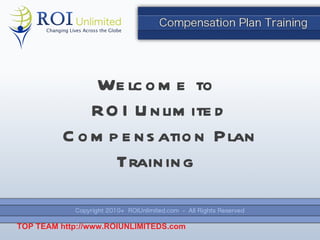 This document summarizes the compensation plan for ROI Unlimited, which has three business levels - Driver Board, Accelerator Board, and Power Board. The Driver Board requires a $250 one-time product purchase and pays $25 commissions. Cycling out earns a $500 bonus and automatic entry to the Accelerator Board. The Accelerator Board requires a $1000 purchase and pays $100 commissions. Cycling out earns a $5000 bonus and automatic re-entry. The Power Board requires a $3500 purchase and pays $100 commissions. Cycling out earns a $20,000 bonus and automatic re-entry. All boards utilize a matrix structure and include bonuses for sponsors when members cycle out.