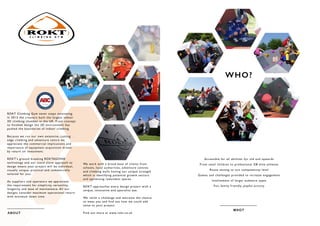 ROKT Ltd is an innovative company that designs and builds 3D modular climbing structures and integrated caving systems. They built the largest indoor 3D climbing chamber in the UK in 2012. ROKT's groundbreaking ROKTAGON technology allows them to create bespoke, visually unique climbing structures tailored to each client's needs and budget. They work with a variety of clients from schools to adventure centers, helping optimize unused spaces. ROKT approaches each design project with a unique, specialized vision to add value for their clients.