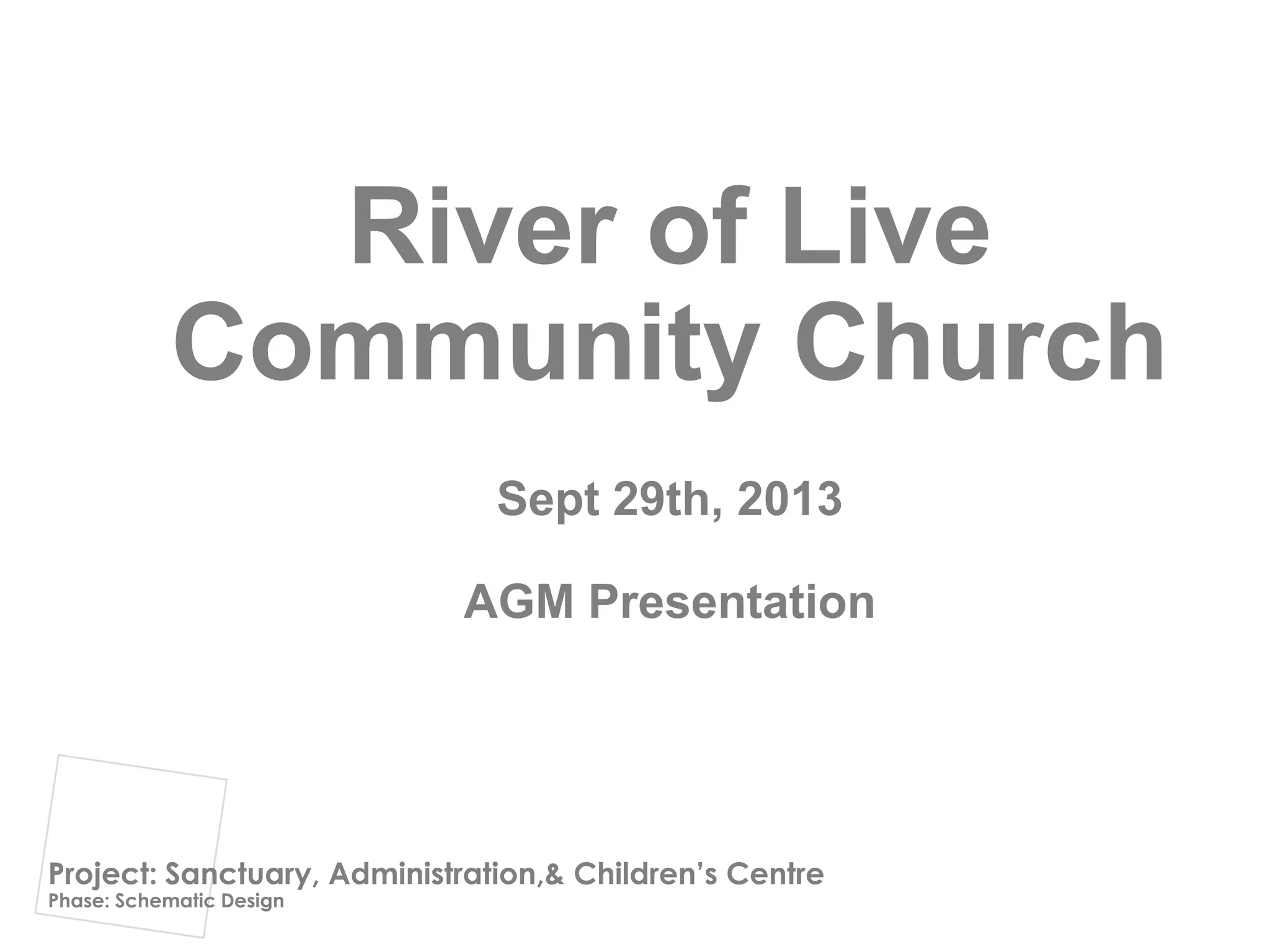 The document appears to be a presentation by Ian Moxon Architect regarding schematic design plans for renovations and additions to River of Live Community Church. The projects discussed include expanding the sanctuary, adding an administration building, and constructing a new children's centre. Floor plans, renderings, and cost estimates are provided for each component of the multi-phase construction project. Funding requirements and strategies for financing the estimated $6.3 million project are also reviewed, including the need for increased monthly donations from church members.