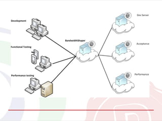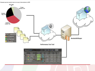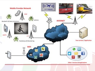 The document discusses mobile performance testing for an application migration project involving over 400 apps. It notes the challenges of testing across different mobile devices, platforms, and networks. Key factors that affect mobile app performance are identified as the device hardware, mobile network connections, and other apps using resources. The document recommends testing apps on real devices across various mobile networks and network conditions to adequately test performance.