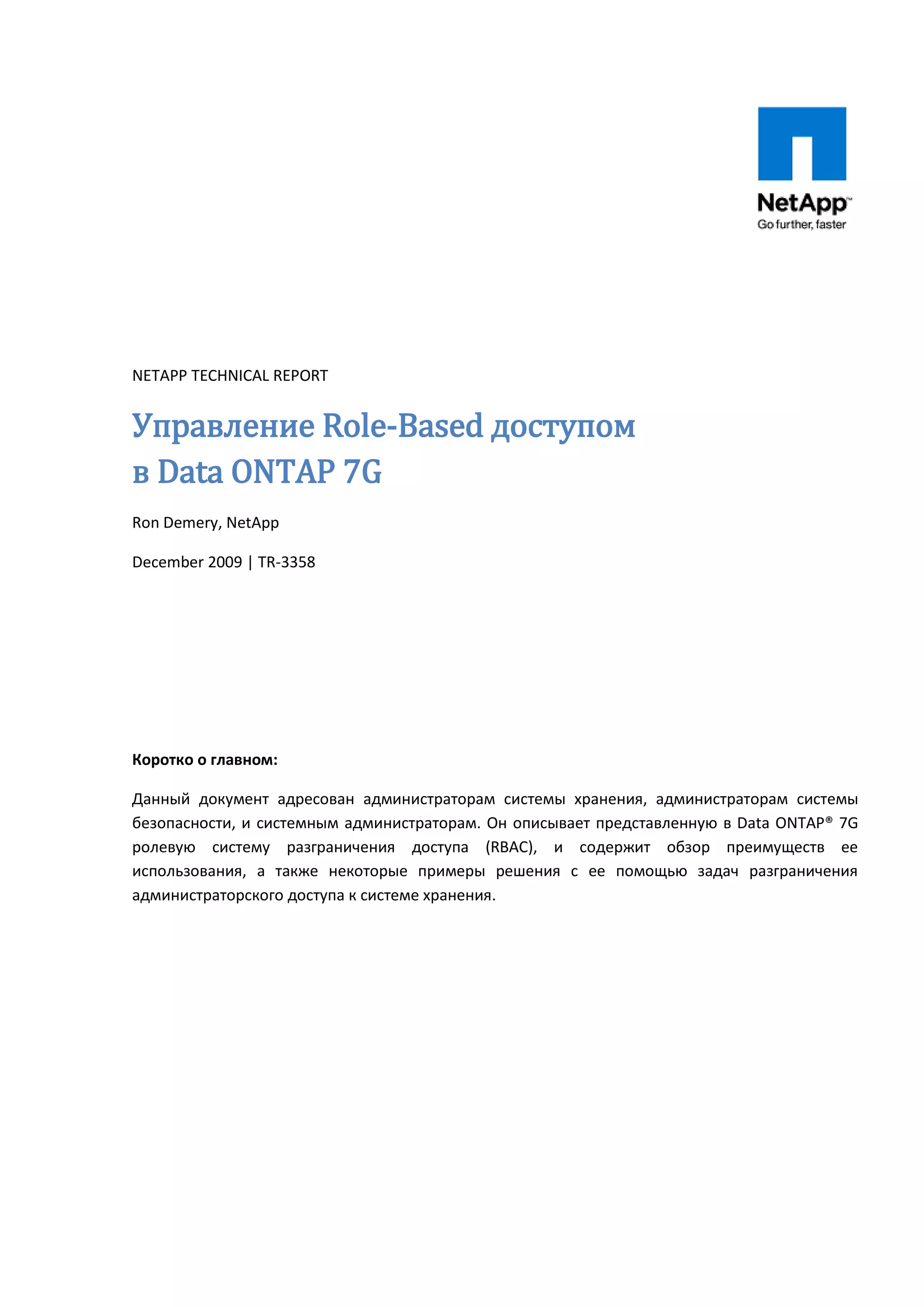 Документ описывает управление доступом на основе ролей (RBAC) в системе хранения Data ONTAP 7G от NetApp, раскрывая преимущества и примеры использования для администраторов системы. Он объясняет взаимодействие пользователей, групп и ролей, а также их интеграцию с Microsoft Active Directory для упрощения администрирования и повышения безопасности. Также рассматриваются возможности и команды для управления пользователями и ролями в системе, что помогает настроить доступ в соответствии с организационными требованиями.