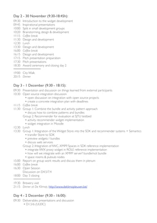 The document summarizes a developer camp that will take place from November 29th to December 2nd, 2011 in Leuven, Belgium. The camp will be held at the Computer Science Department of Katholieke Universiteit Leuven. Each day of the 4-day event has a scheduled agenda that includes introductions, demonstrations, development activities, presentations, and social events. The goal of the camp is for developers to work on widget development for the ROLE software system and collaborate on integration with other open source projects.