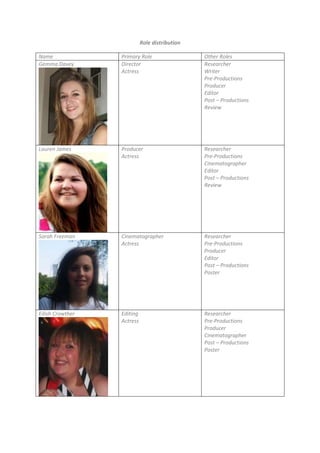 This document outlines the roles of four people on a film production, with Gemma Davey listed as the Director who also acts, researches, writes, and assists with pre-production, editing, and review; Lauren James is the Producer who also acts, researches, films, edits, and assists with review; Sarah Freeman is the Cinematographer who also acts, researches, assists with pre-production, editing, and post-production tasks; and Eilish Crowther handles Editing and also acts, researches, assists with pre-production, filming, and post-production including posters.