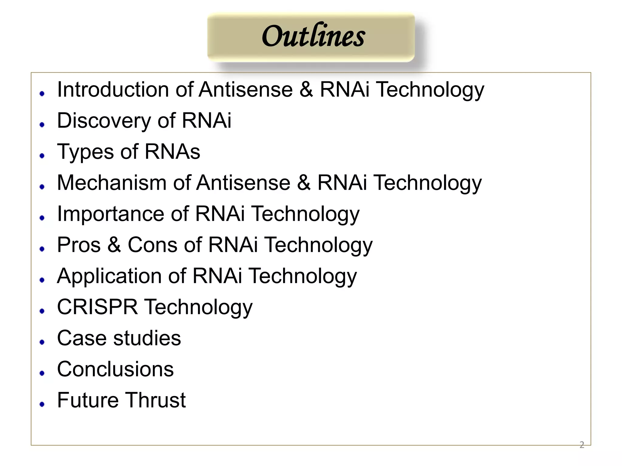 This document presents information on RNA interference (RNAi) and its application in crop improvement. It discusses the discovery of antisense RNA and RNAi technology. The mechanisms of antisense technology and RNAi are described. Advantages of RNAi include its ability to study essential genes and its high specificity. Applications include crop protection and gene therapy. Case studies demonstrate improved insect resistance in transgenic tobacco plants and the role of miRNAs in syncytium formation induced by cyst nematodes.