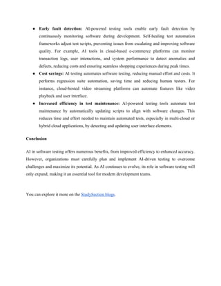 Artificial Intelligence is revolutionizing software testing by improving speed, accuracy, and efficiency through automation. AI-powered testing provides comprehensive test coverage, quicker execution, early detection of faults, enhanced precision, and cost savings, all while minimizing manual labor. As AI technology advances, its significance in software testing will grow, becoming a vital resource for contemporary development teams. Discover more about AI in software testing on the StudySection blogs.