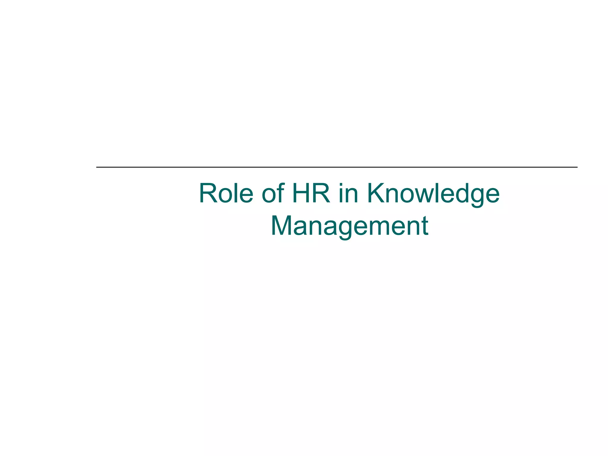 This document discusses the role of HR in knowledge management. It defines knowledge and knowledge management, and outlines the knowledge management processes. It discusses how HR can facilitate knowledge sharing through practices like job rotations, training, knowledge communities, and aligning incentives. The document argues that HR should drive a culture of collaboration and knowledge sharing through communication, workshops, and making knowledge management part of company training modules. HR is positioned as a key facilitator for institutionalizing knowledge management.