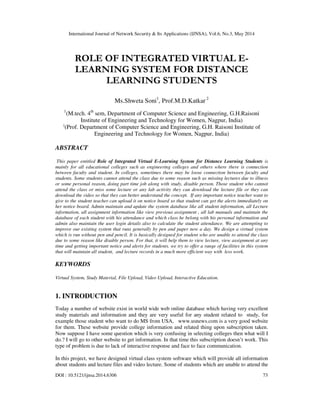 The document discusses the development of an integrated virtual e-learning system designed for distance learning students, particularly those who may miss classes due to illness, job commitments, or disabilities. This system allows students to access lecture materials, assignments, and notices anytime, facilitating improved communication between faculty and students while addressing inefficiencies in traditional education methods. The proposed solution aims to enhance user-friendliness, data management, and report generation, ultimately supporting students' educational pursuits more effectively.