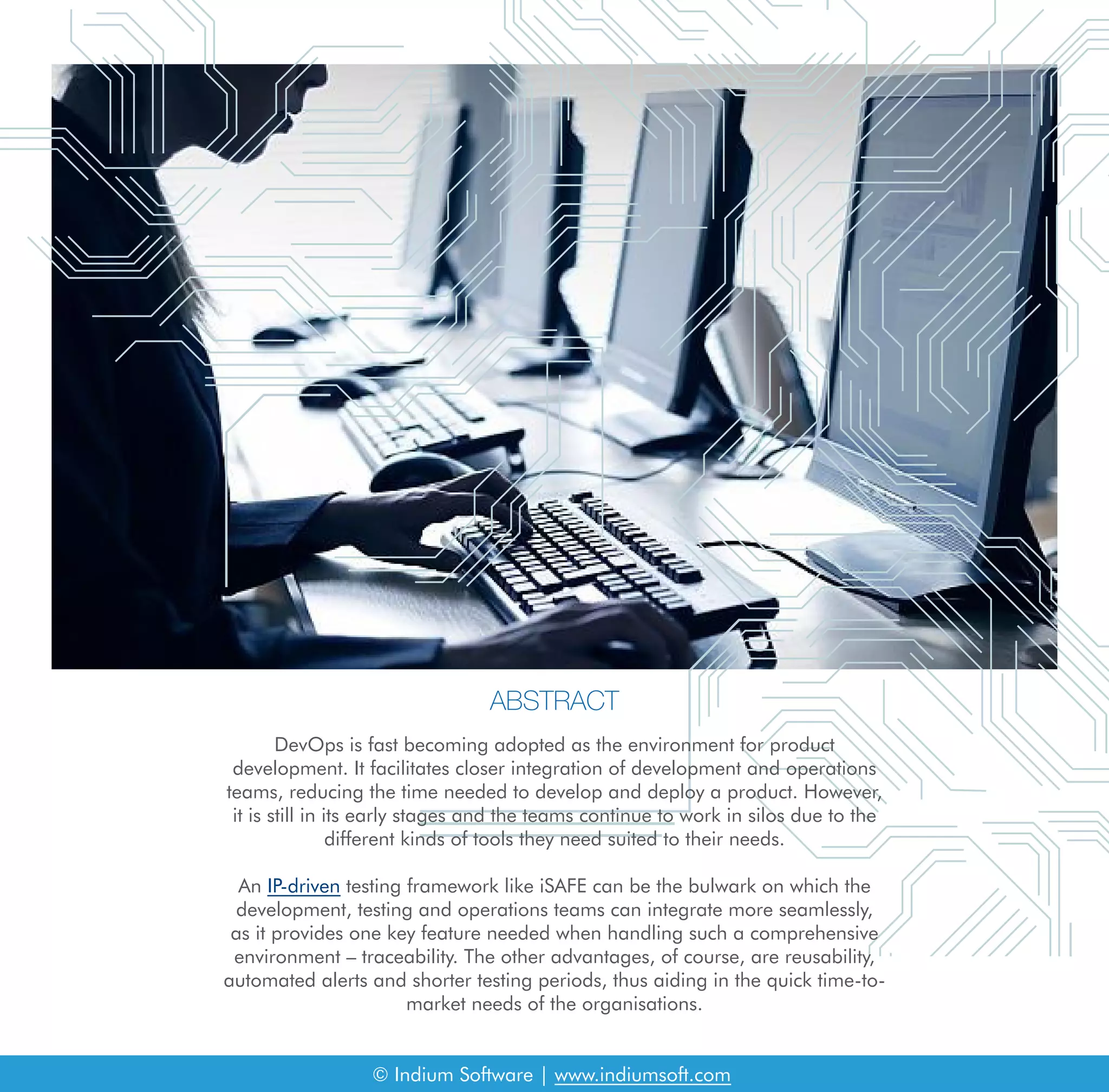 The document discusses the integration of DevOps and test automation frameworks, particularly focusing on the iSAFE/iMobi framework that enhances collaboration between development and operations teams. It highlights the benefits of automation, such as improved traceability, reusability, and reduced testing times, which facilitate quicker product releases. The adoption of DevOps is growing, but challenges persist due to varying tools and methodologies that still keep teams in silos.