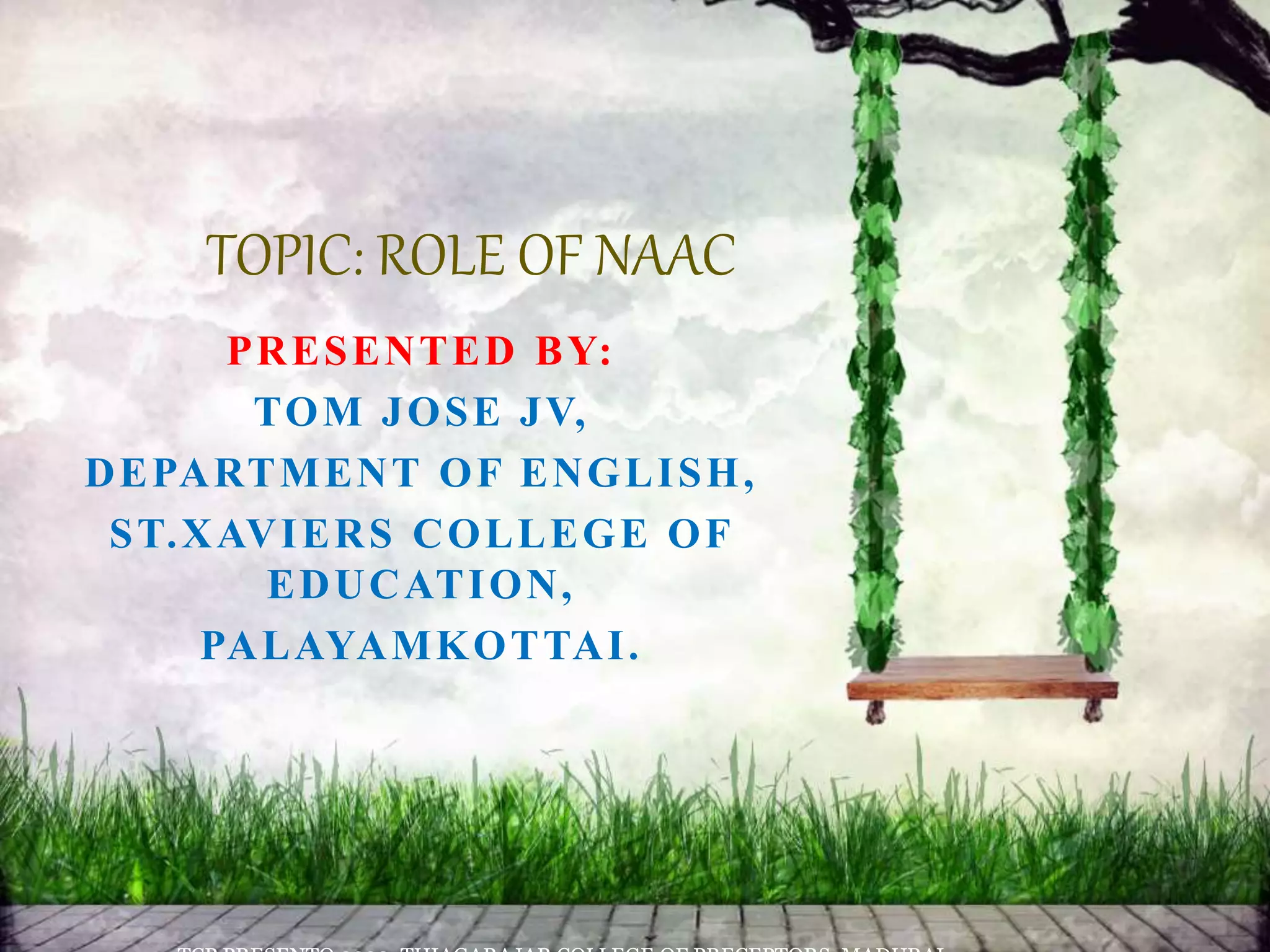 The National Assessment and Accreditation Council (NAAC) was established in 1994 as an autonomous body under the University Grants Commission. NAAC assesses and accredits higher education institutions in India on certain criteria through a self-study report and peer review process. Its accreditation is mandatory for universities to be eligible for UGC grants and financial aid. NAAC has accredited over 122 universities and 2,486 colleges so far.