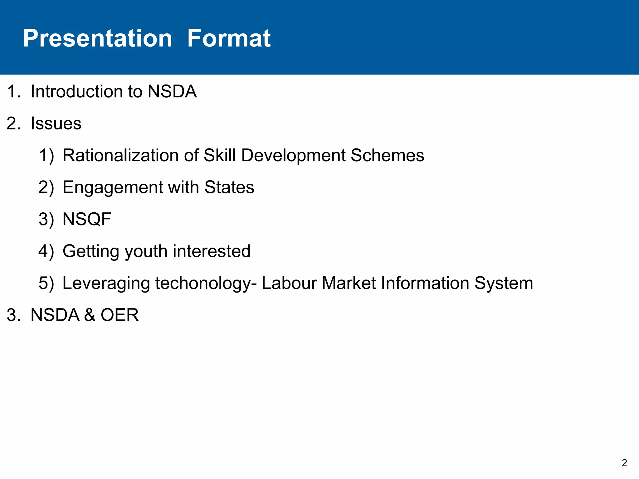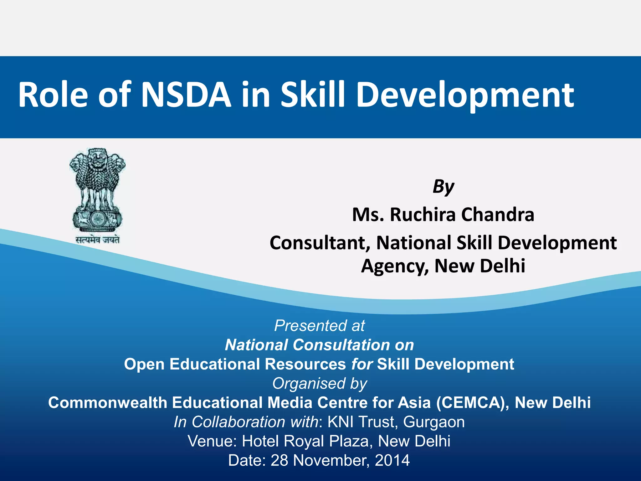 The document discusses the role of the National Skill Development Agency (NSDA) in India. It outlines 5 key issues in skill development that NSDA is working to address: 1) rationalizing skill development schemes, 2) improving state-level skill development structures, 3) implementing the National Skills Qualifications Framework, 4) increasing interest in skills training among youth, and 5) creating a reliable labor market database. It also describes NSDA's efforts to develop an inventory of online education resources to promote open and accessible skills learning.