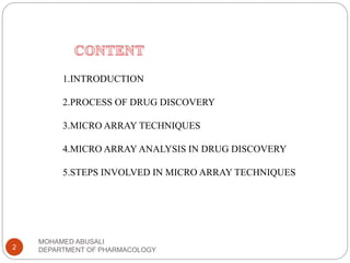 The document outlines the drug discovery process, focusing on genomics and microarray techniques, including their role in identifying gene expressions relevant to drug development. It covers the steps involved in drug discovery, various types of microarrays, and the analysis of genetic data to facilitate personalized medicine. Additionally, it discusses the technical aspects of microarrays and the significance of their application in understanding disease mechanisms.