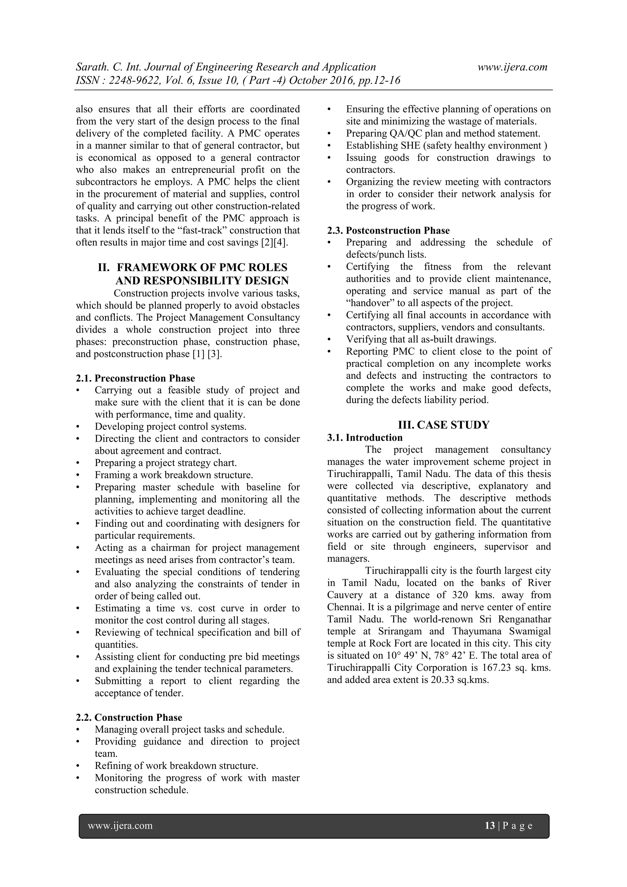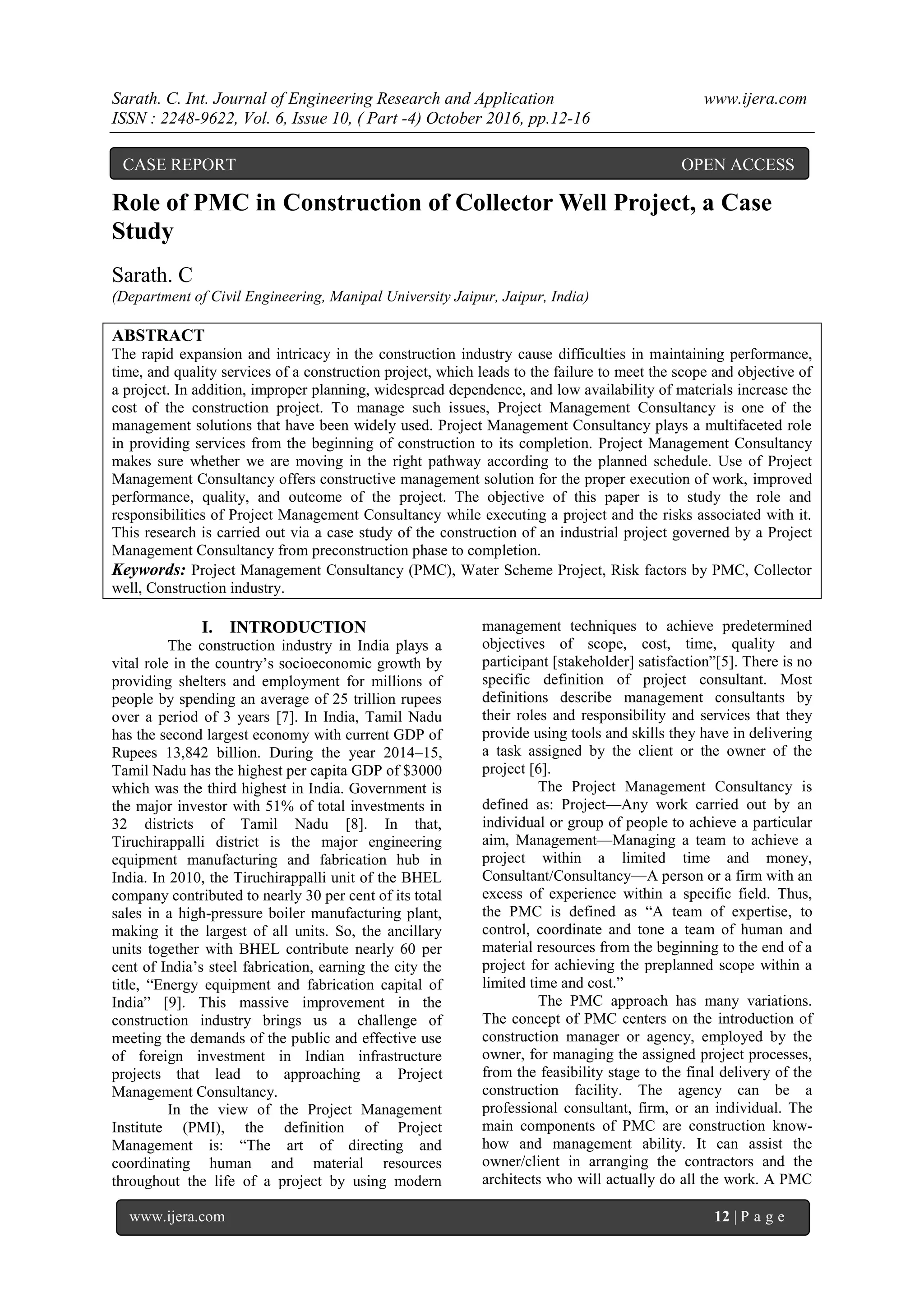 This document discusses the role of Project Management Consultancy (PMC) in the construction of a collector well project in Tiruchirappalli, India, emphasizing the challenges in the construction industry such as cost overruns and quality assurance. The study highlights the PMCs responsibilities during the project's preconstruction, construction, and postconstruction phases, including risk management and effective resource allocation. It concludes that PMCs are crucial for project execution and addressing issues like delays and unforeseen circumstances that can impact timelines and outcomes.