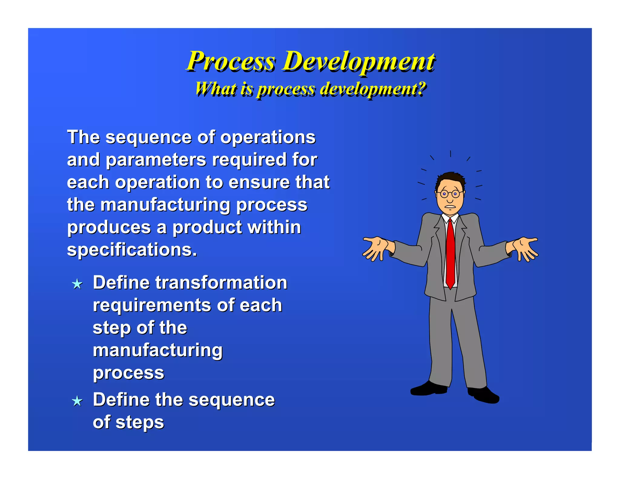 The document discusses process development for automation. It defines process development as determining the sequence of operations and parameters to ensure a manufacturing process produces products within specifications. It notes that automation will change tools, sequences and remove the human element from processes. It advises to identify current manual processes carefully, qualify and test any process changes, and minimize risks when developing automated processes. It provides tips on machine design for process development, including using programmable controllers, sensors and flexible framing.