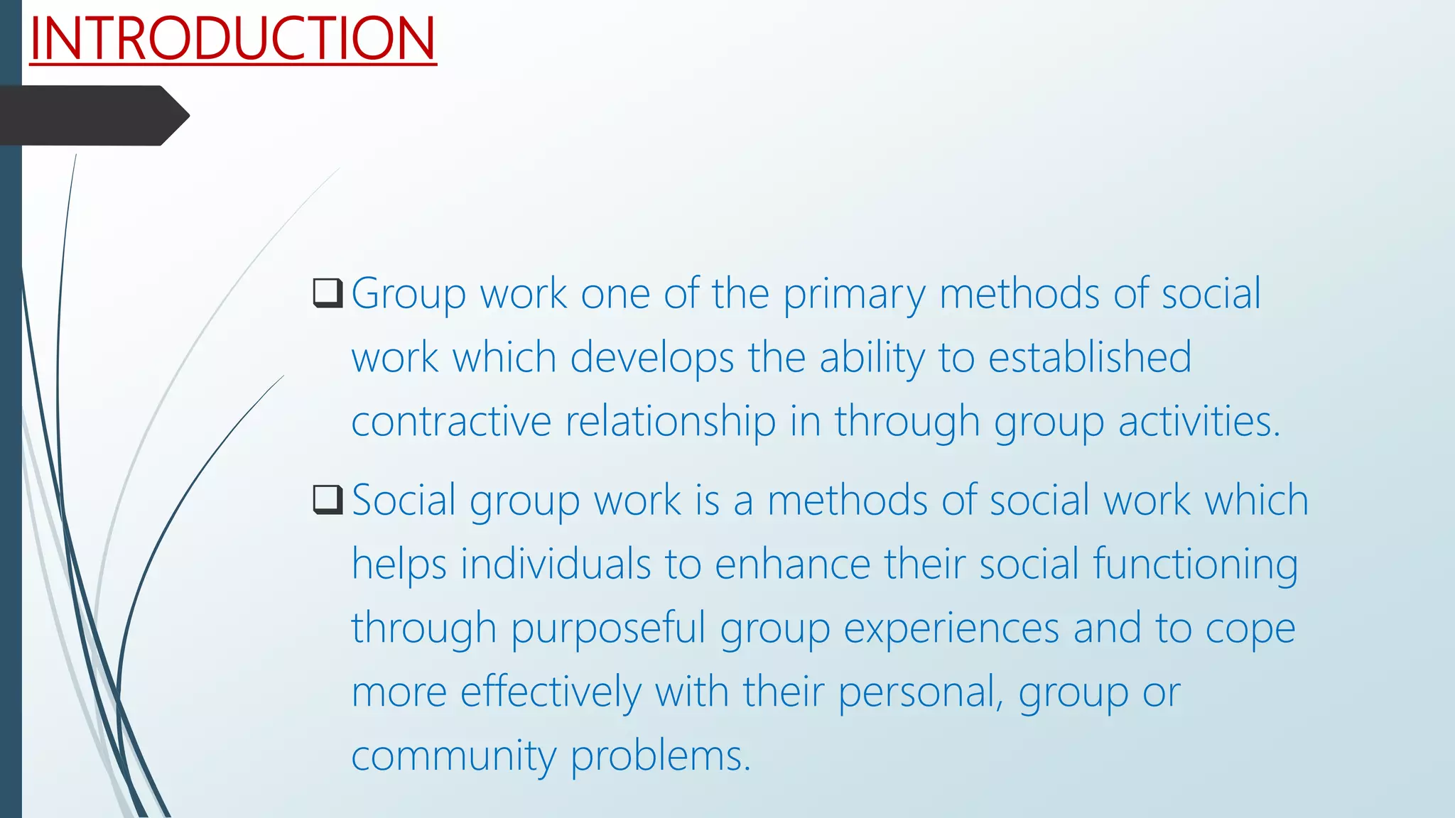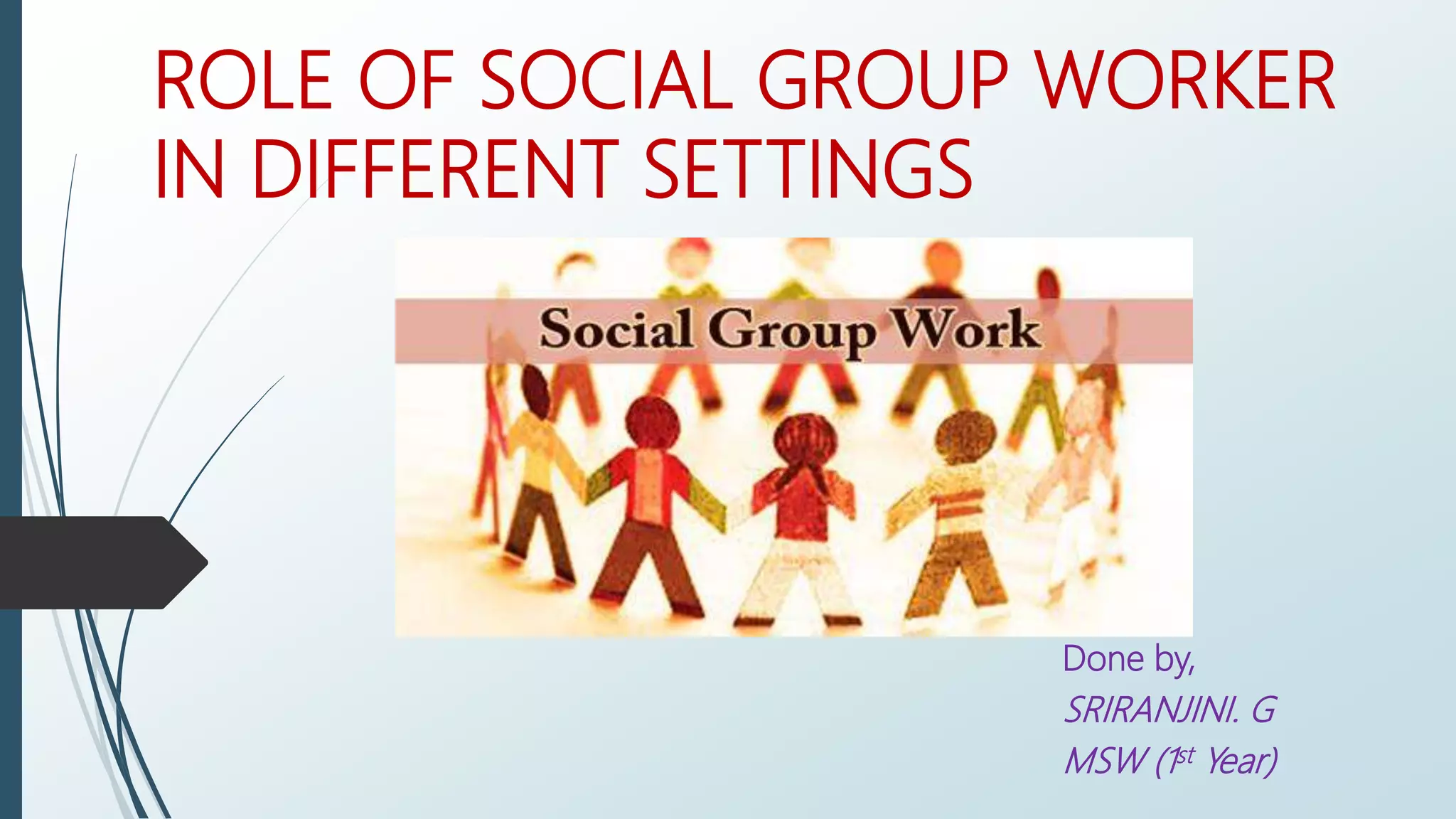 The document discusses the role of social group workers in various settings. Social group workers help individuals enhance their social functioning through purposeful group activities. They work in community development settings, industries, prisons, educational institutions for children and youth, institutions for children and adolescents, and services for the aged. In each setting, social group workers form groups to address setting-specific issues like skills development, emotional support, education, recreation, and adjustment. They aim to improve individuals' well-being and ability to cope with personal and social problems through collaborative and therapeutic group activities.