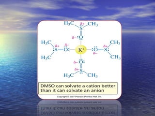 The document discusses the crucial role of solvents in chemical reactions, emphasizing their ability to influence reaction rates and solubility. It details the differences between protic and aprotic solvents, their interactions with solute molecules, and the importance of solvent polarity in SN1 and SN2 reactions. Additionally, it introduces the concept of phase transfer catalysis, showcasing the mechanism by which immiscible reagents can react efficiently through the use of a catalyst.