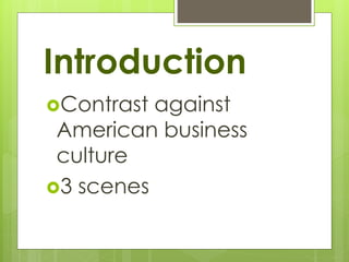 This document outlines a role play between Japanese and American business cultures. It is divided into 3 scenes that highlight cultural differences. Scene one shows bowing and exchanging business cards in Japan compared to a lack of this in America. Scene two demonstrates indirect communication and non-fast decision making in Japan versus more directness in America. Scene three contrasts prioritizing work over personal life in Japan against separating work and personal life in America.