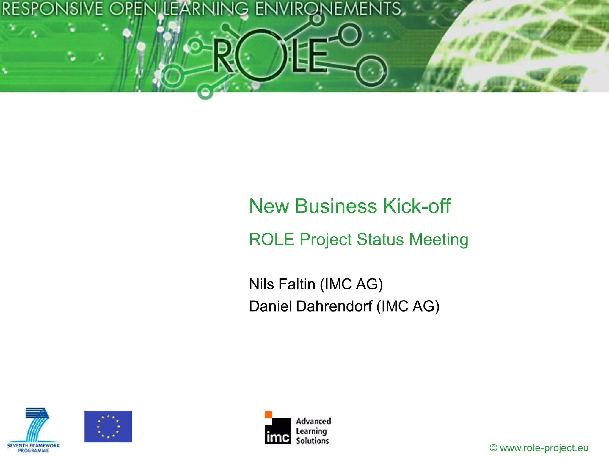 The document outlines the ROLE project, which focuses on creating responsive open learning environments with a budget of €8,500,000 and a duration of 48 months. Key responsibilities of IMC include developing a service syndication platform and learning widgets, along with exploring educational frameworks and methodologies. Next steps for the project involve enhancing recommendation services, evaluating technology in testbeds, and promoting open-source community engagement.