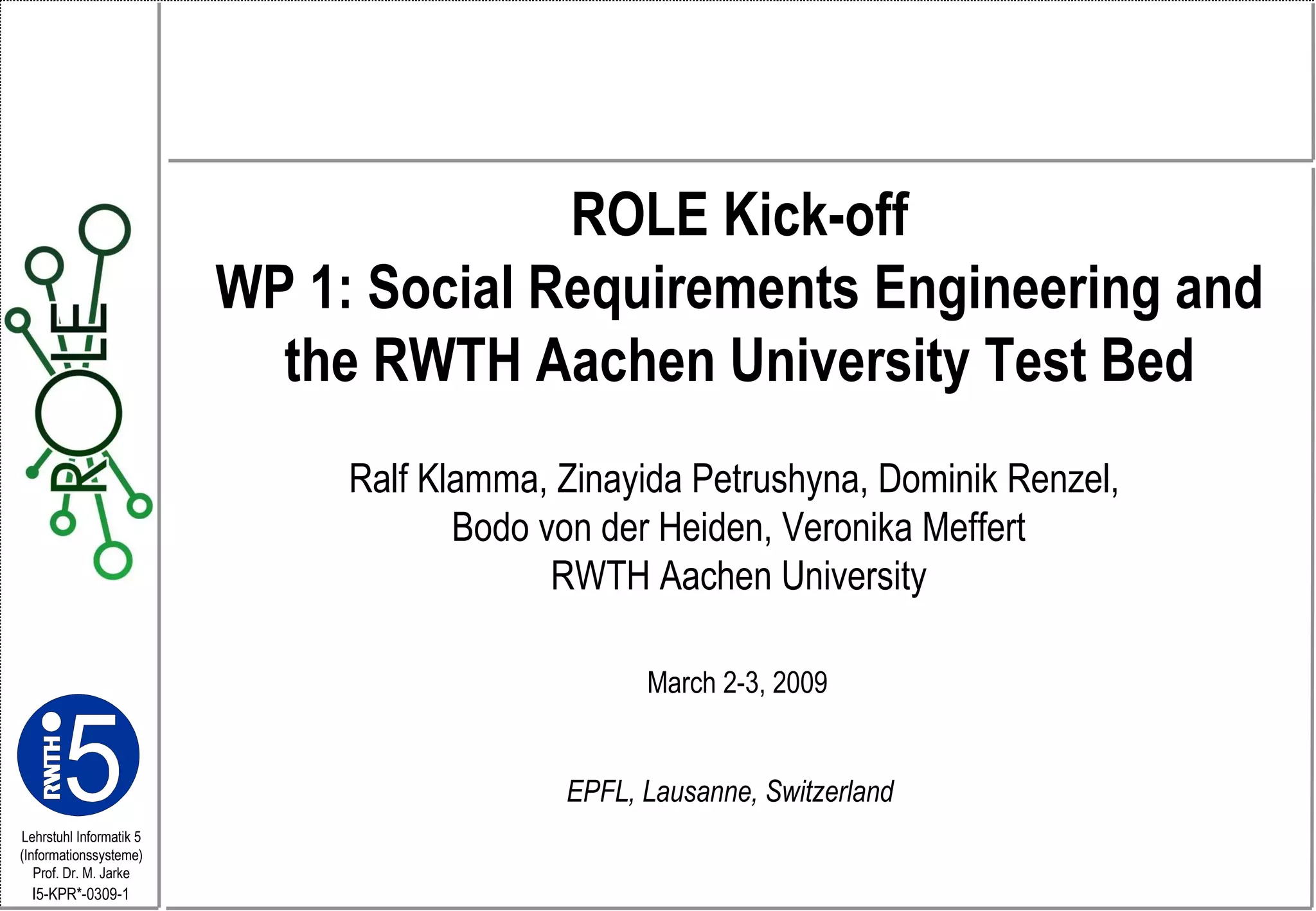 This document discusses social requirements engineering and the RWTH Aachen University test bed. It outlines approaches for continuous requirements engineering including collaborative processes and adaptation models. It also describes using social network analysis and visualization tools to integrate requirements engineering into online communities and platforms.
