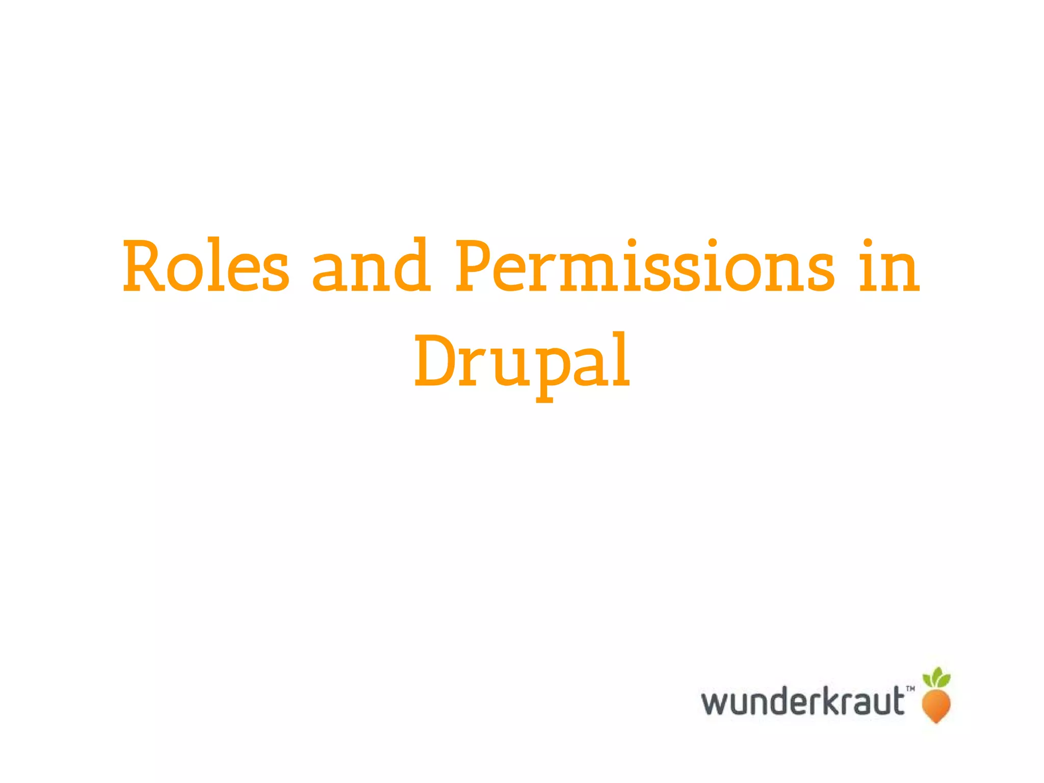 Drupal uses roles and permissions to control user access. There are default roles like authenticated user, administrator, and manager. Permissions are set at the People > Permissions page and control actions like accessing admin pages, commenting, and custom permissions for modules. New roles need permissions assigned and permissions should be checked when new content types or modules are added.