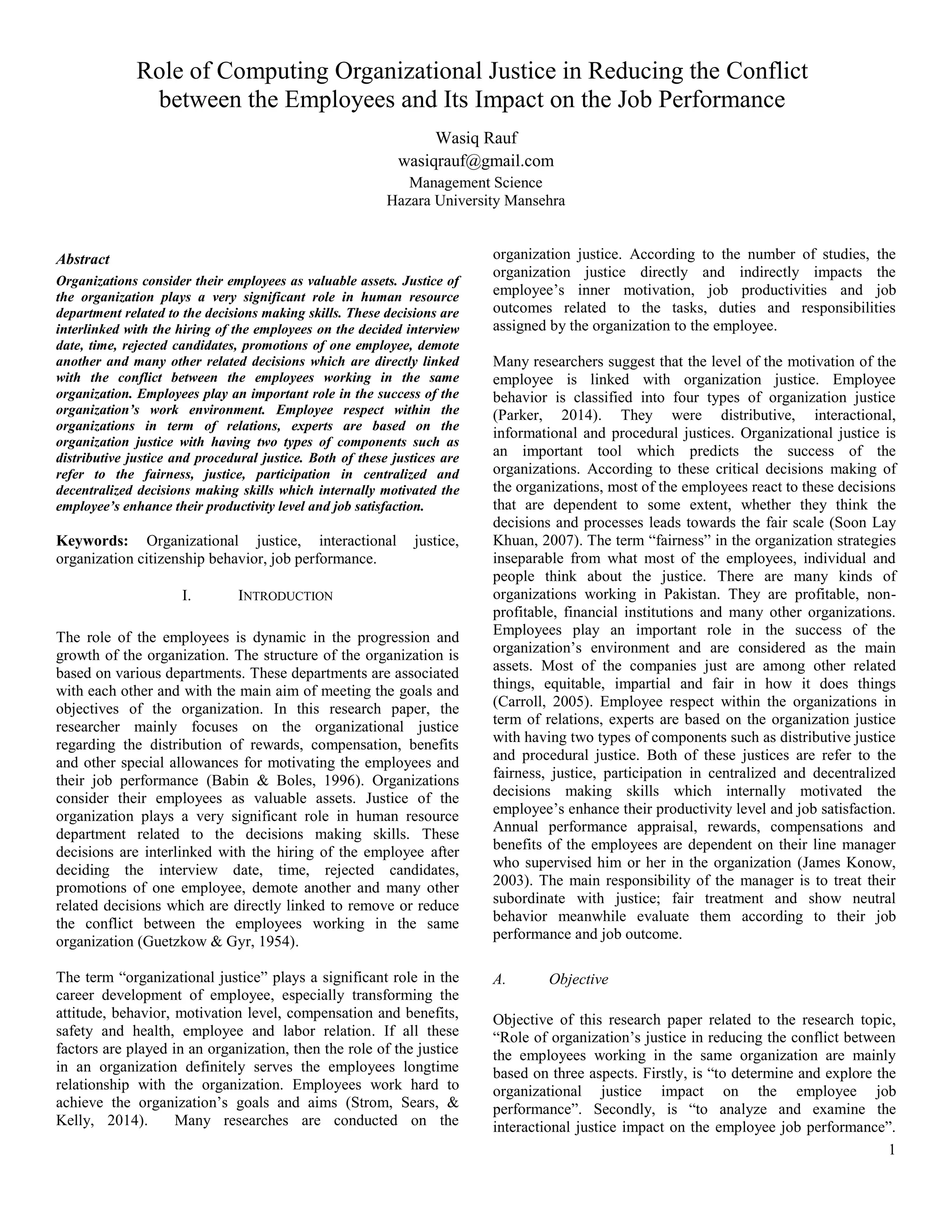 This document discusses organizational justice and its impact on employee performance and reducing conflicts. It begins with an abstract noting that organizational justice plays a significant role in human resources decisions around hiring, promotions, etc. and how this impacts employee motivation and productivity.