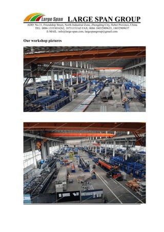 The document provides detailed specifications and information regarding a container-loaded anode plate roll forming machine offered by Large Span Group, including its features, technical data, and operational capabilities. The machine is constructed with various high-quality components from established brands, has a maximum forming speed of 15-20 meters/min, and a whole life warranty for certain parts. It also includes a quotation for purchase, payment terms, installation costs, and other operational details necessary for prospective buyers.