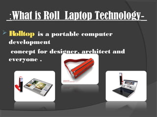 Rolltop is a portable computer concept proposed by Mohanad al-Safadi that consists of a monitor and keyboard that roll together into a compact form. Key components include the monitor and keyboard, power supply, pen screen, and control buttons. It is designed to be very light to carry and easier to use than a laptop while maintaining similar functionality.