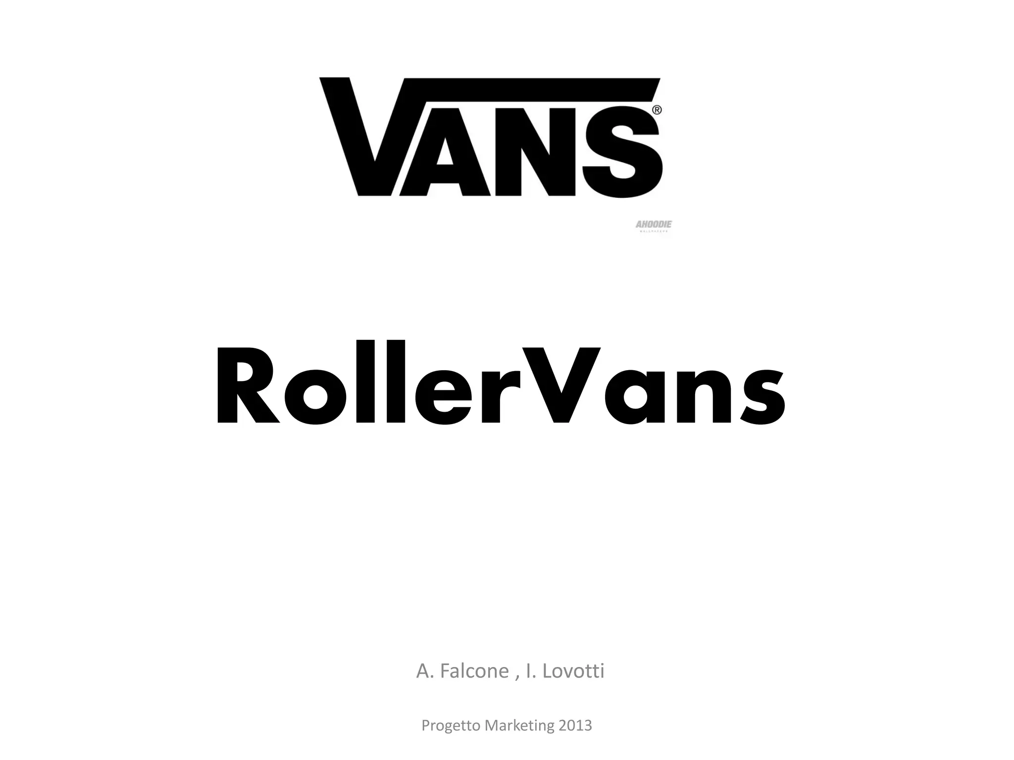 Il documento analizza la situazione ambientale per il progetto marketing 2013 di Rollervans, evidenziando punti di forza come un brand noto e opportunità nel mercato statunitense, ma anche debolezze nell'esperienza del mercato e minacce da infrastrutture inadatte. Inoltre, viene effettuata un'analisi della quota di mercato dei roller skates e del comportamento del consumatore, con Rollervans attualmente nella fase di introduzione rispetto a concorrenti come Rollerblade e Fila, già affermati. Viene infine delineata una strategia di marketing che include targetizzazione, posizionamento e programmi di marketing operativo.