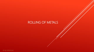 The document discusses various types of rolling mills used to roll metals, including two high, three high, two high reverse, four high, multi, universal, and planetary rolling mills. It describes the basic setup and functions of two high, three high, two high reverse, four high, and cluster rolling mills. Additionally, it mentions tandem, universal, and planetary rolling mills as well as shape rolling operations like ring and thread rolling. Finally, it lists some common defects in rolled metal parts.