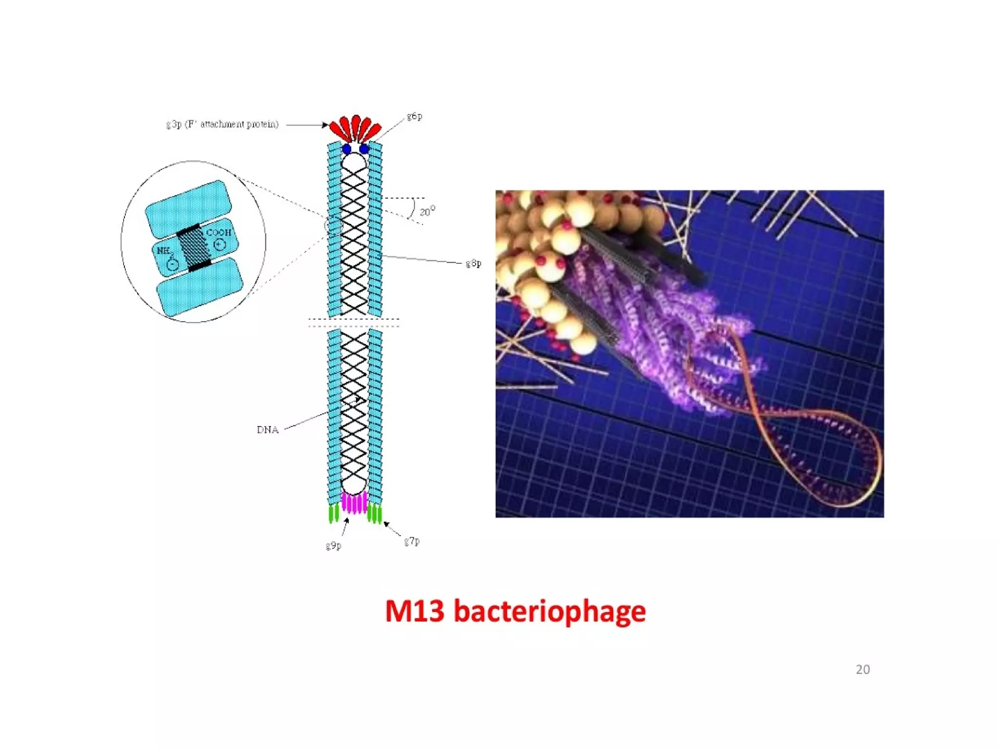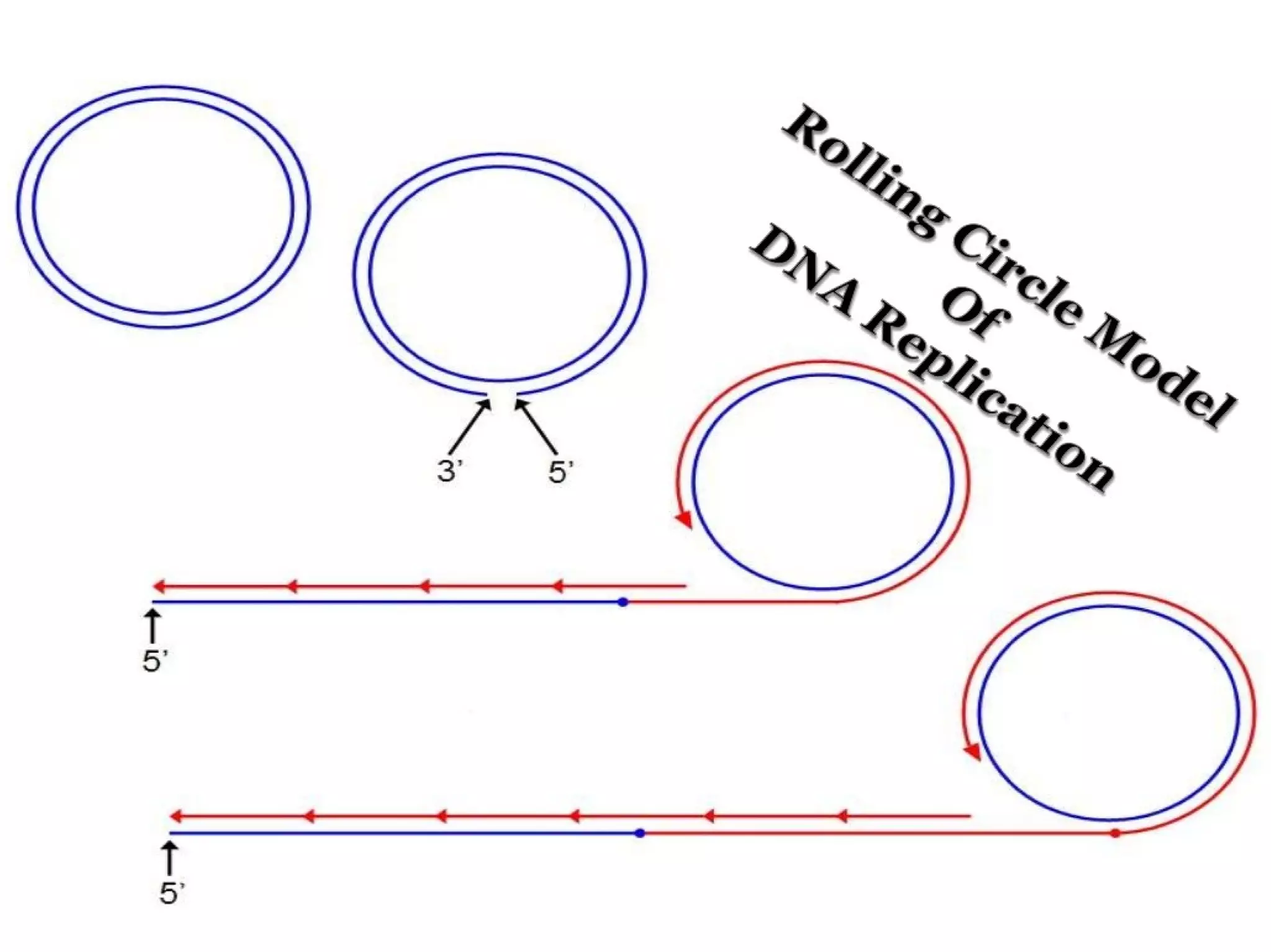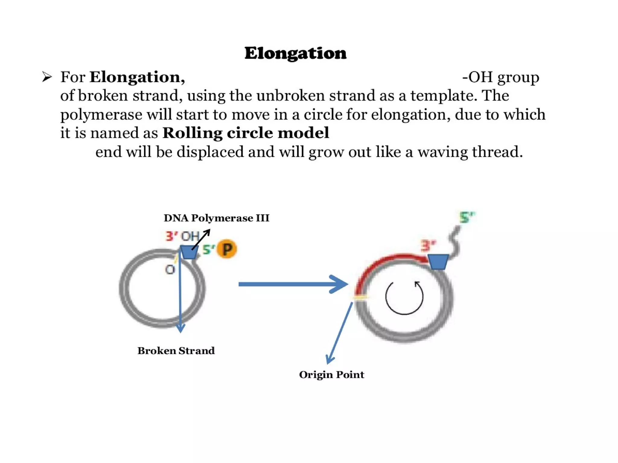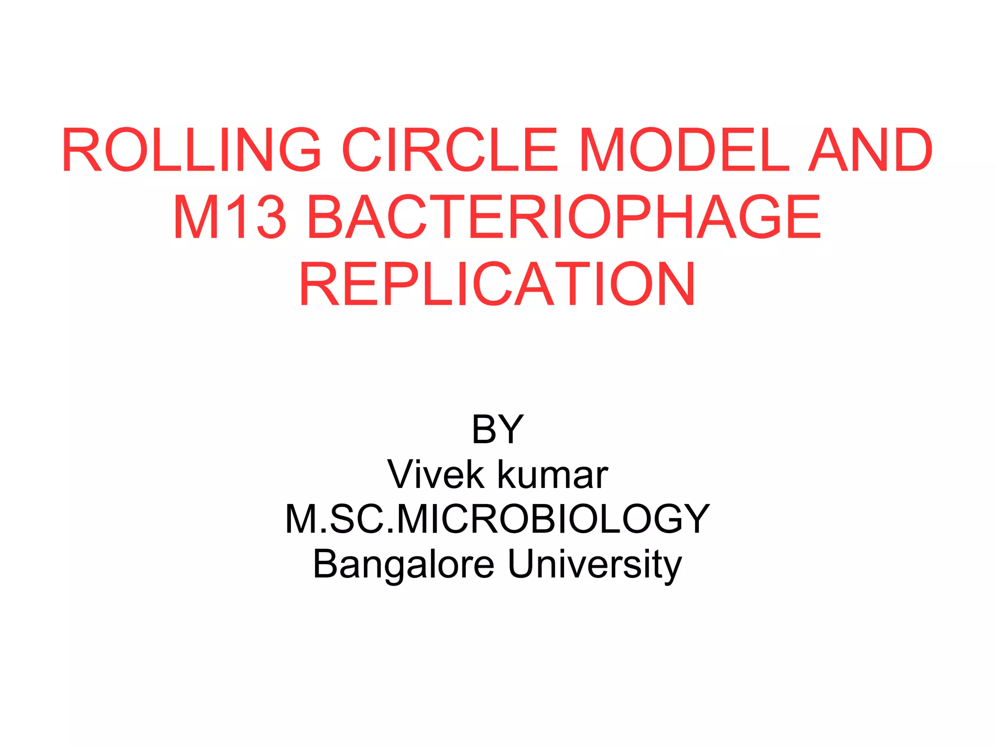 This document summarizes rolling circle replication and the replication of M13 bacteriophage. Rolling circle replication involves the nicking of one strand of circular DNA by an initiator protein. DNA polymerase then uses the unnicked strand as a template to synthesize multiple copies of the DNA in a continuous head-to-tail series. These linear copies can then be converted to circular DNA molecules through additional processing. Replication of M13 bacteriophage involves its single-stranded DNA entering an E. coli cell and being converted to double-stranded replicative form DNA. A phage protein then nicks the viral DNA to allow replication and production of progeny phage genomes and assembly of new viral particles.