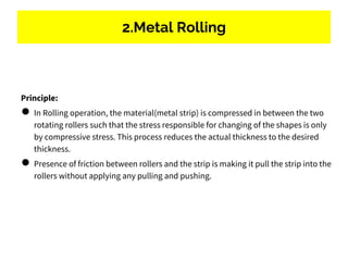 Rolling is a metal forming process where metal stock is passed through one or more pairs of rotating rollers to reduce the thickness and change the cross-section of the metal. There are two main types of rolling: hot rolling, where the temperature of the metal is above the recrystallization temperature, and cold rolling, where the temperature is below the recrystallization temperature. To avoid bending during rolling, the surface velocity of the top and bottom rollers must be equal. There are several types of rolling mills including two high, three high, four high, cluster, and tandem mills which differ in their roller configurations and applications. Rolling is used to mass produce a variety of products like sheets, rods, tubes, bol