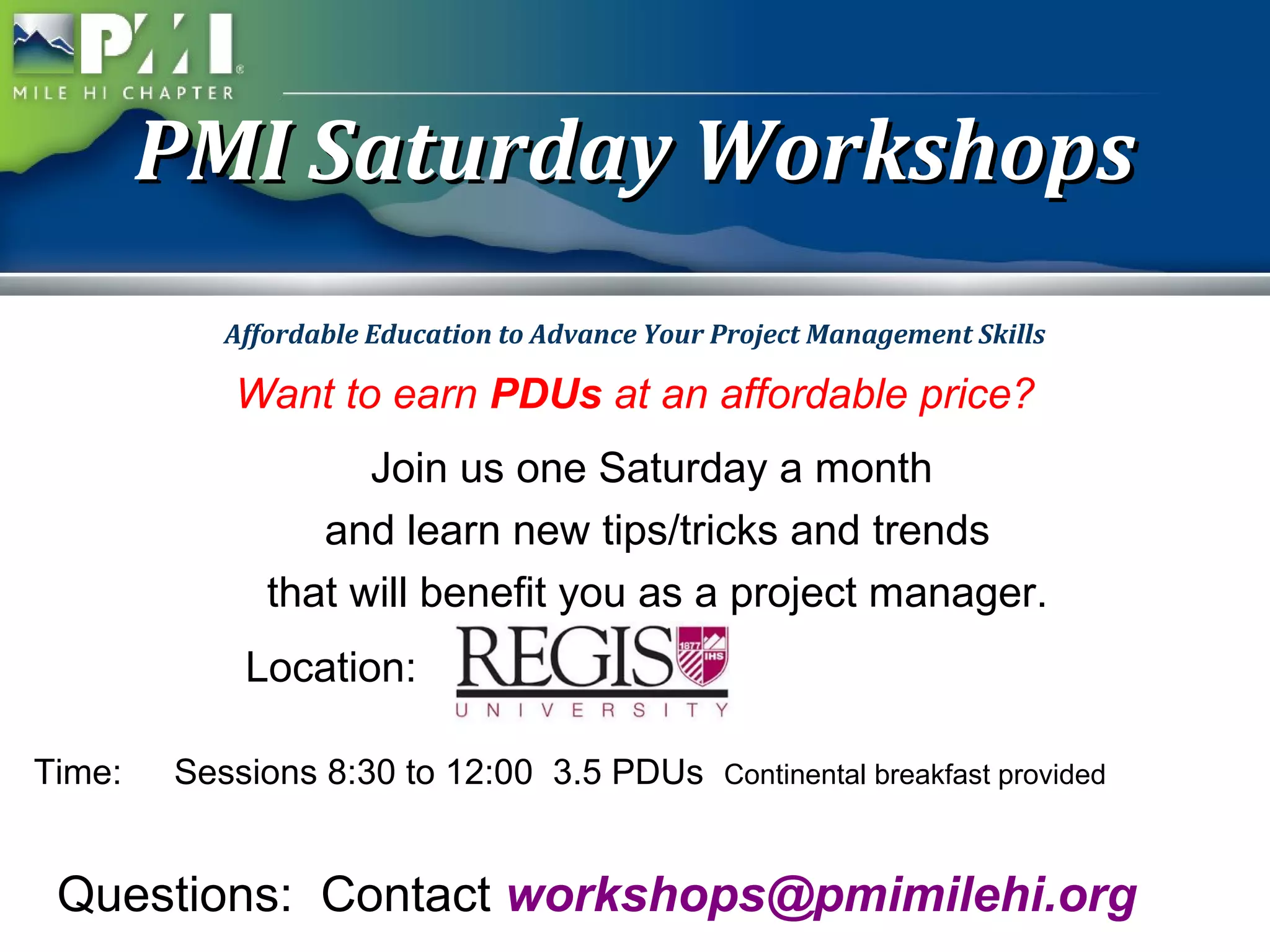 This document provides information about the PPMMII SSaattuurrddaayy WWoorrkksshhooppss hosted by the PMI Mile Hi Chapter. It announces workshops on the first Saturday of each month from December 2014 through February 2015. Each workshop provides 3.5 PDUs and covers topics like project management tools, lean process methodology, and change management. Location, time, presenter bios and contact information are included for each session. Benefits of PMI and Mile Hi Chapter membership are also summarized. Volunteer opportunities with the chapter are described.