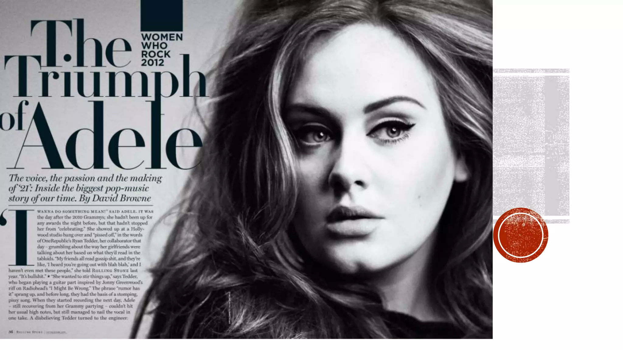 The double page spread features a close-up black and white image of Adele on the right that draws the reader's eye. The minimal makeup represents Adele focusing on her music alone. The article will reveal details about Adele's career and past. The simple, bold image and writing style maintain Rolling Stone's house style. The headline and quotes suggest the article will discuss Adele's success and true personality.