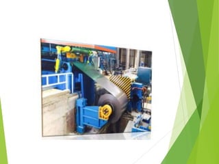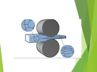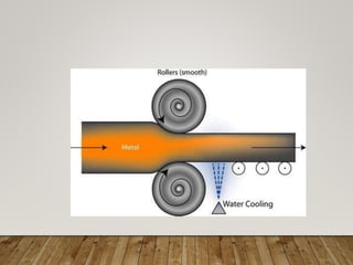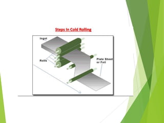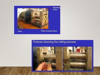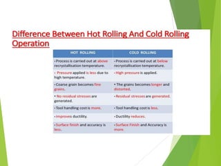 The document discusses various aspects of rolling processes. It defines rolling as a metalworking process that uses compressive forces exerted by rolls to reduce the thickness or change the cross-section of a workpiece. It describes the basic components of a rolling mill and the functions of rolls. It also discusses types of rolling like flat rolling, shape rolling, ring rolling, and thread rolling. Key differences between hot and cold rolling are explained along with advantages and disadvantages of each. Various products produced from rolling like plates, sheets, strips are also mentioned.