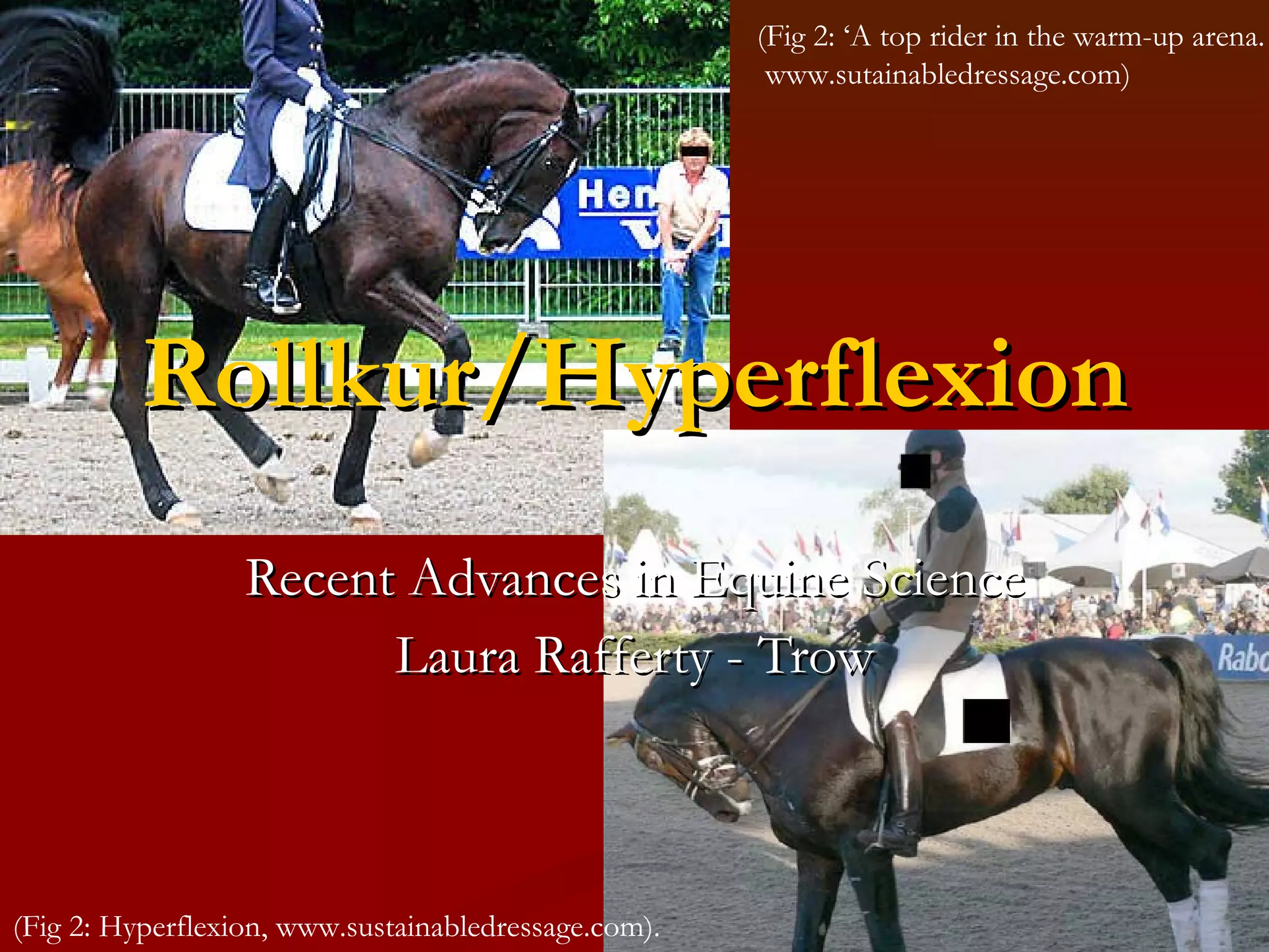 Rollkur, also known as hyperflexion, is a controversial training technique in dressage where a horse's neck is flexed below the vertical plane, forcing the poll and neck into an arched position. Proponents argue it improves collection and impulsion, while critics argue it reduces welfare and increases stress on the horse. Several studies have found rollkur increases workload and displays of fear or discomfort in horses, though its effects on biomechanics are still unclear. The debate around rollkur remains ongoing, with questions around its long term impacts and whether it provides performance benefits.
