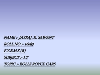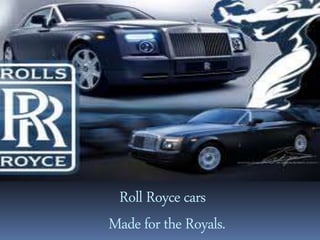 This document provides an overview of Rolls-Royce cars. It discusses that Rolls-Royce was founded in 1904 by Henry Royce and Charles Stewart Rolls and is considered the ultimate automobile manufacturer. It gained fame for its Silver Ghost model, which over 6000 units were sold. Rolls-Royce was also used in World Wars 1 and 2 by the British military. The document outlines some of Rolls-Royce's most famous models over time and notes that while it started making luxury cars for royalty, it later aimed to make cars for the masses to counter the Great Depression.
