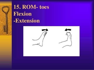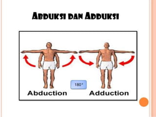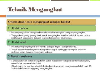 Dokumen ini membahas berbagai jenis latihan fisik dan manfaatnya bagi kesehatan tubuh, termasuk peningkatan fungsi sistem kardiovaskuler, respiratori, metabolik, dan muskuloskeletal. Selain itu, terdapat penjelasan tentang latihan rentang gerak untuk pasien dengan keterbatasan mobilisasi serta berbagai posisi yang digunakan selama perawatan. Pengkajian intoleransi aktivitas dan prosedur pemindahan pasien juga dijelaskan sebagai bagian dari intervensi keperawatan.