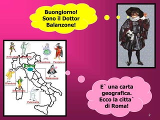 Il documento è una guida turistica che presenta Roma attraverso la voce del dottor Balanzone e della guida Rugantino. Vengono descritti importanti luoghi e monumenti della città, come Piazza Venezia, il Colosseo e la Basilica di San Pietro, evidenziando la loro storia e significato culturale. La visita si conclude con un invito ai turisti a tornare a Roma, sottolineando la bellezza della città.