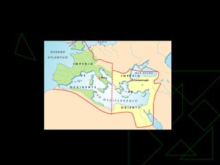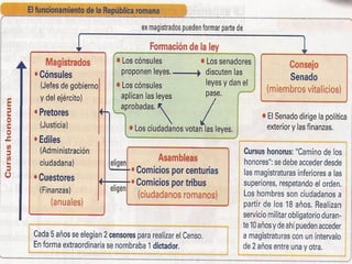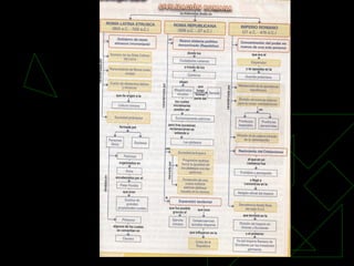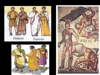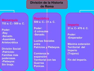 La civilización romana pasó por tres etapas: la Monarquía (753-509 a.C.), la República (509-31 a.C.) y el Imperio (31 a.C.-476 d.C.). Roma se ubicó estratégicamente en el centro de Italia junto al río Tíber, lo que le permitió expandirse. La sociedad romana temprana estuvo dividida entre patricios, plebeyos y esclavos. La República trajo un gobierno compartido entre cónsules, senado y asambleas populares