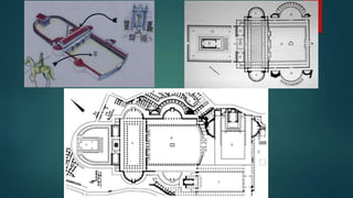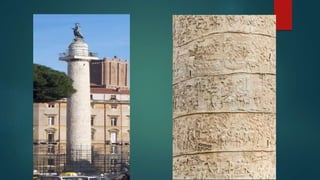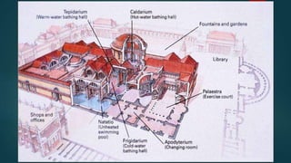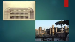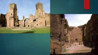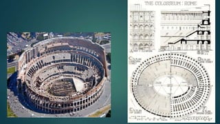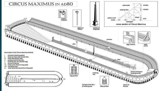 The document provides information on Roman architecture and sports venues. It discusses the Circus Maximus, including its oblong design with a central barrier and ability to accommodate 250,000 spectators. Details are given on its starting gates and viewing stands. The Colosseum is also described, noting its elliptical shape, four floors of arcades, 80 entrances, and capacity of 50,000 people. The types of events and animals involved in inaugural games are mentioned. Other topics covered include the Forum of Trajan with its Basilica Ulpia and Trajan's Column, as well as the Thermae of Caracalla public baths complex.