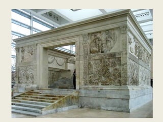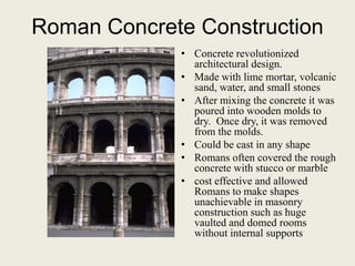 The document summarizes Roman architecture from the Republican period through the Late Empire. During the Early and High Empire periods (27 BCE - 192 CE), Roman architecture advanced with developments like concrete construction, which allowed grand vaulted spaces and domes. Iconic buildings from this era included the Pantheon with its record-breaking concrete dome, as well as amphitheaters like the Colosseum in Rome. Aqueduct engineering also flourished as the Romans built bridges and channels to carry water over long distances. Monumental arches like the Arch of Titus commemorated imperial accomplishments.