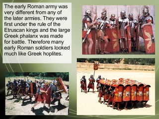 1) The early Roman army was originally influenced by the Etruscans and Greeks, with soldiers resembling Greek hoplites.