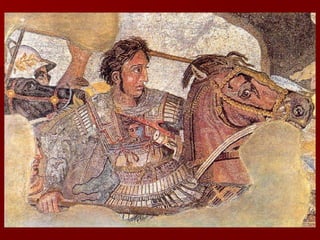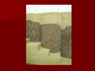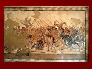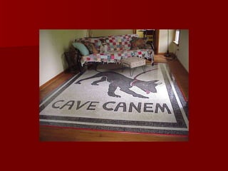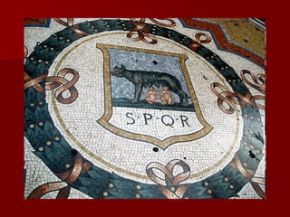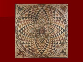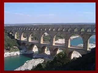 Roman architecture evolved over time, with innovations like the arch and concrete allowing them to construct grand structures. The Romans advanced architectural forms originated by previous civilizations and developed techniques like the rounded arch. Major Roman constructions discussed include the Pont du Gard aqueduct, the Colosseum, the Pantheon, and widespread use of mosaics in decorative art. These constructions showcase the Romans' architectural abilities and innovations in materials like brick and concrete.