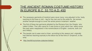 The ancient Romans adopted their early clothing styles from the Greeks, wearing tunics that reached the knee for men and ankle for women. Materials included wool, linen and leather from local farms, later importing luxurious fabrics like silk, cotton and fine linen. Clothing indicated social status, with married women wearing a stola overdress and men a toga on formal occasions. Cosmetics and hairstyles also varied over time. Roman art included mosaics, frescoes, sculpture and architecture displayed in homes and public buildings.