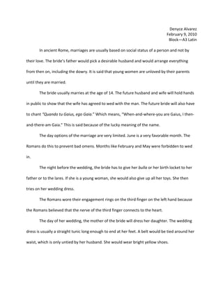 In ancient Rome, marriages were arranged by fathers based on social status rather than love. Young women typically married at age 14. Wedding ceremonies involved the bride and groom holding hands and reciting vows, and were usually held in June to avoid bad omens. Ceremonies included a procession to the groom's house after a feast, with guests throwing nuts to represent fertility. Traditions such as throwing bouquets and rice have roots in ancient Roman wedding customs of extinguishing torches and throwing nuts.