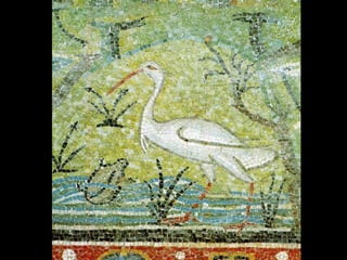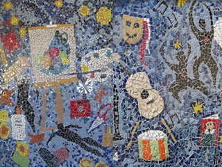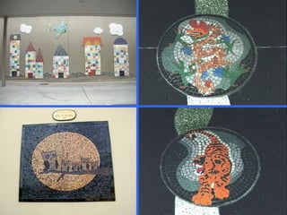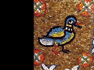 Mosaics are pictures or decorations made of small pieces of materials like stone, glass, or ceramic. The art of mosaics dates back to ancient times and was widely used by the Romans to depict gods, daily life, and geometric patterns. Ravenna, Italy is particularly renowned for its well-preserved Byzantine mosaics from the 5th-6th centuries depicting emperors and religious scenes. Mosaics continue to be an artistic medium today through works by modern artists like Niki de Saint Phalle and references to past designs.