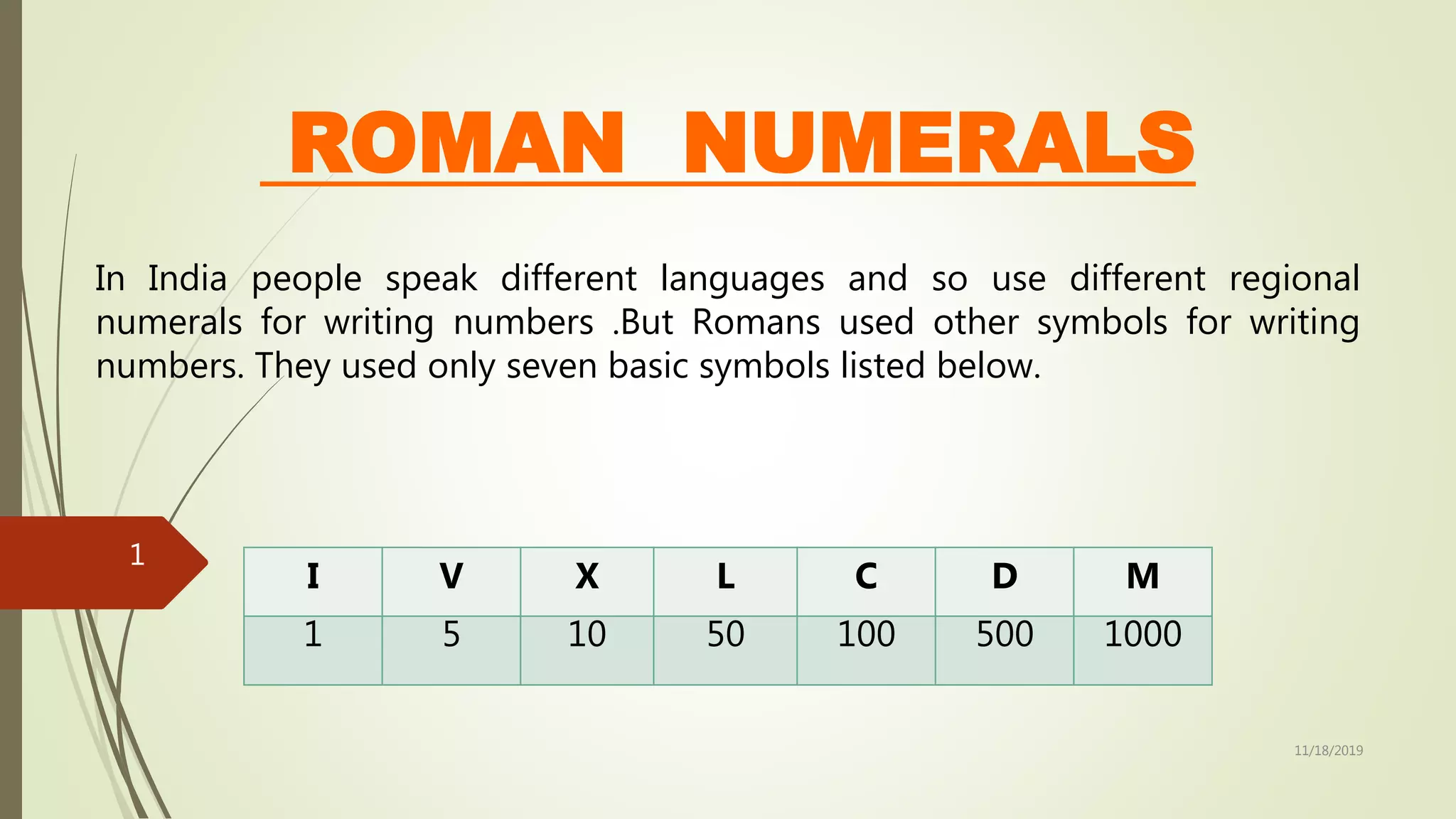 The document discusses the Roman numeral system. It lists the seven basic symbols used - I, V, X, L, C, D, and M, along with their values. It then outlines four rules for writing numbers using Roman numerals: 1) repetition of I and X indicates addition, 2) smaller numbers to the right of larger are added, 3) I to the left of V or X is subtracted, and 4) numbers between 10-40 are written as groups of tens and ones. Several examples are provided to demonstrate the rules. The document concludes by providing practice problems to convert between Hindu-Arabic and Roman numerals.