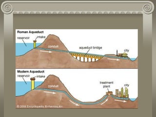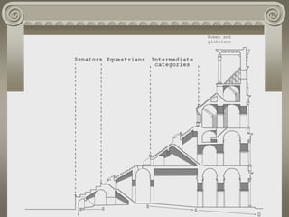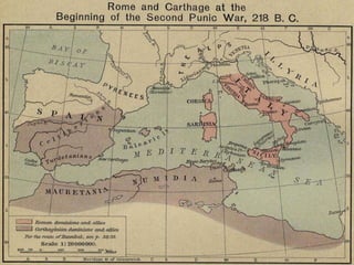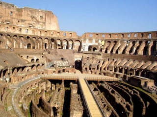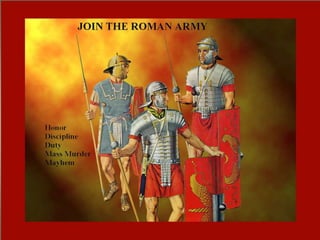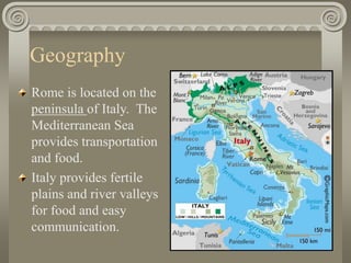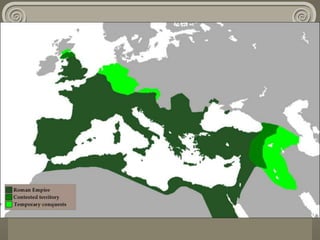 Rome was founded as a republic in 509 BCE, with a government led by senators and two annually elected consuls. Romans were polytheistic and adopted Greek gods like Jupiter and Juno. Society was divided into patricians and plebeians. The Roman Republic expanded across Italy and conquered territories through a powerful army composed of citizen-soldiers. After a period of instability, Augustus established the Roman Empire, bringing two centuries of peace and prosperity under imperial rule. However, the western empire eventually declined due to invasions, economic troubles, and governmental corruption.